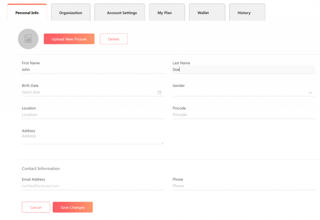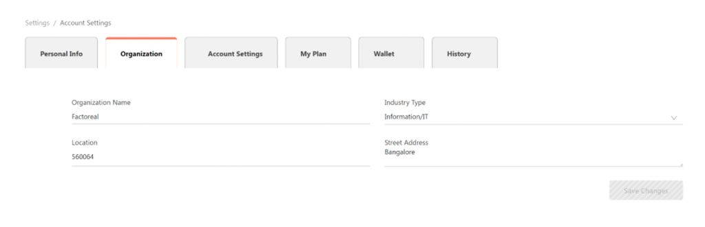 - On the Organization tab, you can update your organization details, such as industry type, organization name, location, etc.