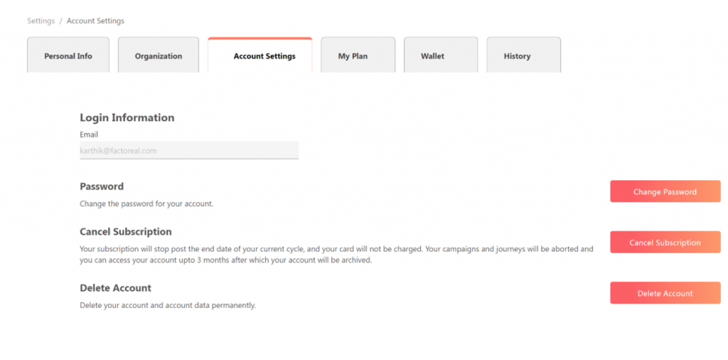 - On the Account Setting tab, you can make changes to your login password, cancel your Factoreal subscription and delete your Factoreal account