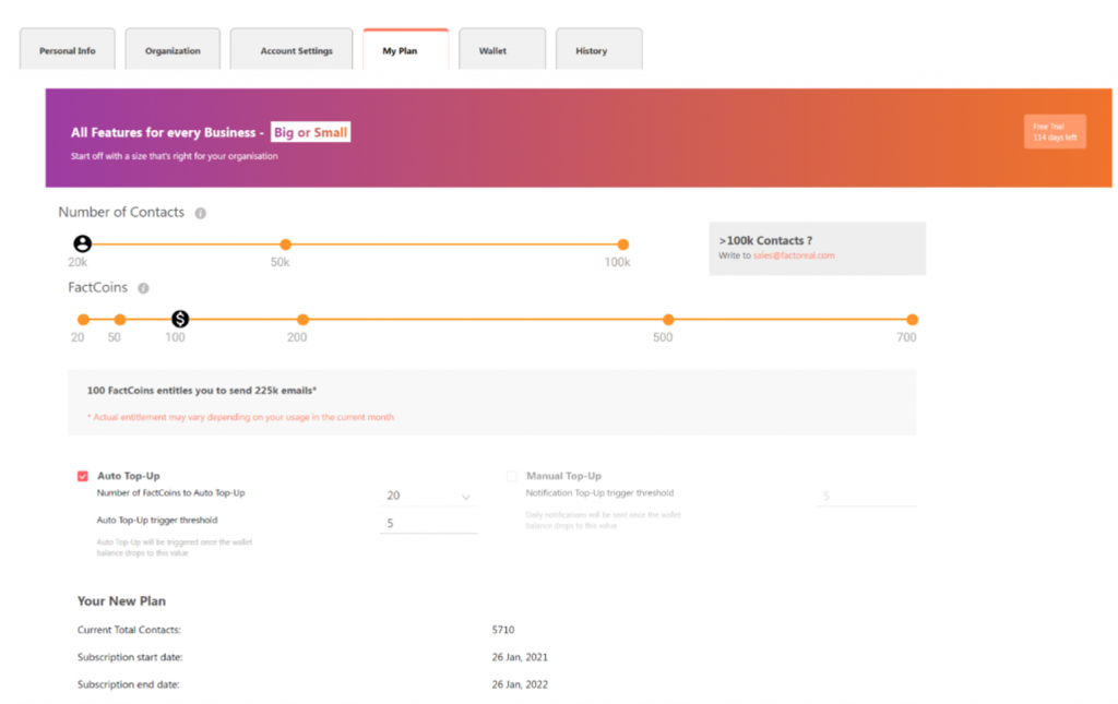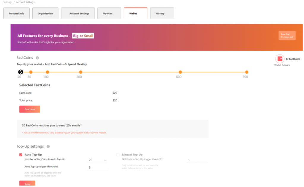 - On the Wallet tab, you can see all the details about your Factoreal wallet balance. You can top-up and make new purchases.